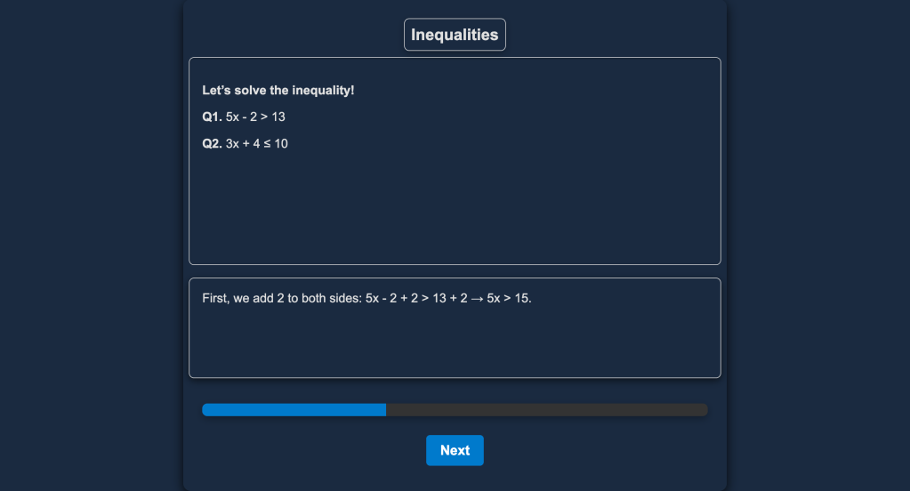 In visual novel lessons, the lesson script is displayed in the dialogue box using a typewriter effect. This allows essential information to be clearly shown to learners, including those with hearing impairments. Learners advance the script by pressing a “Next” button, which also fills a progress bar.